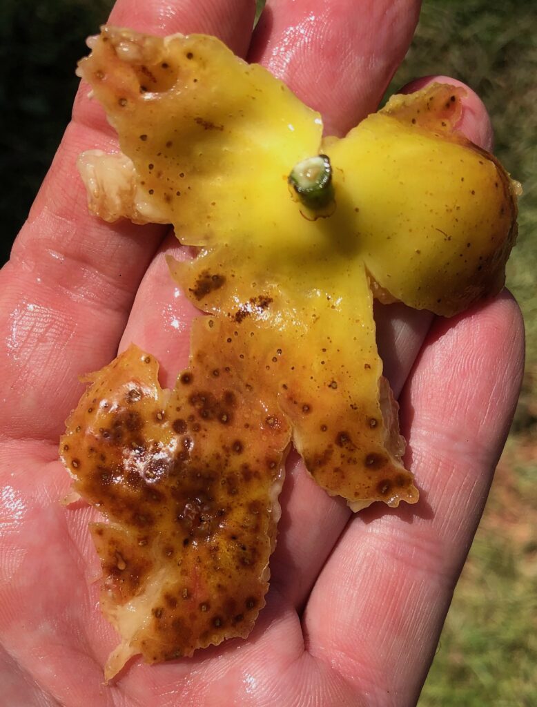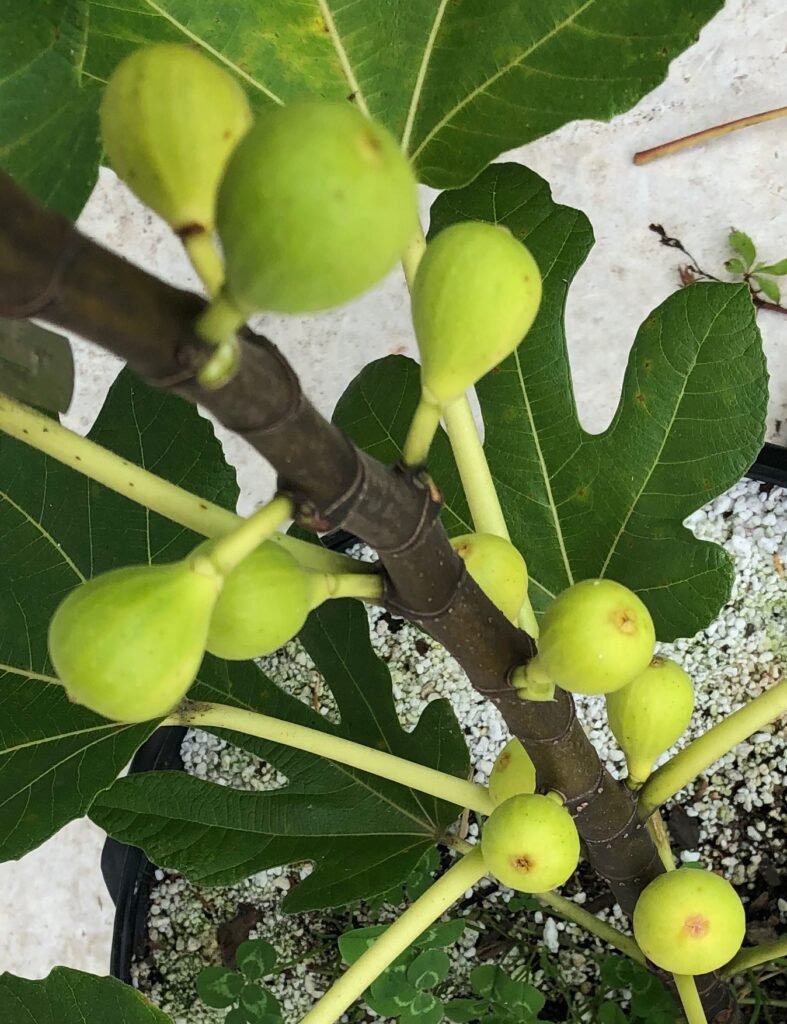 Though Sunrise is producing edible figs on a very young tree, many are still droppers. The figs that are edible are much smaller than Brian’s caprified specimens and more of a honey fig with some light fruity and berry tones.
