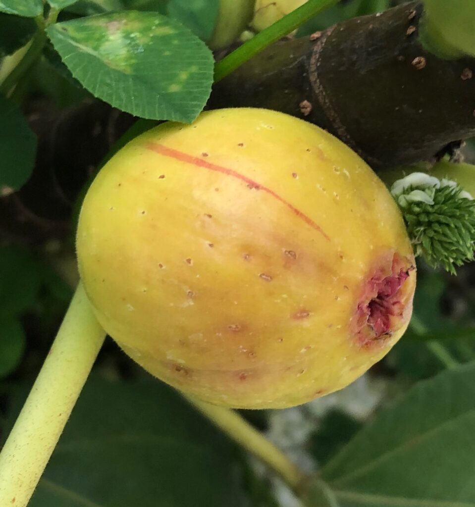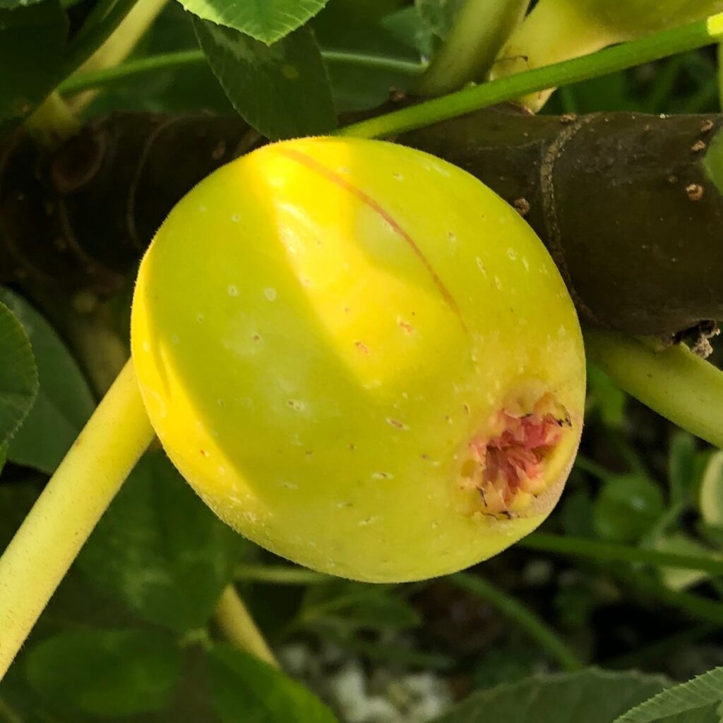 One day I was watering my Sunrise and noticed a larger fig that was yellow, with tan/brown colored spots (prolly from fertilizer overspray) all over it. It didn’t really look good. I picked it. It didn’t really feel right and I fully expected it to be all dry inside like the previous figs. To my surprise, it was full of juicy golden pulp, with red highlights. I didn’t have my phone with me and was really excited to try it. It was more of a sweet honey fig, with some fruity hints. Nothing like Brian’s caprified specimens. There were numerous very tiny seeds, so essentially no seed crunch.